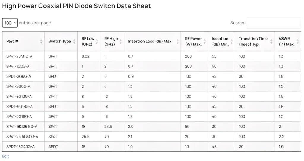 | الجزء # | نوع المفتاح | RF منخفض (جيجاهرتز) | RF عالي (جيجاهرتز) | فقدان الإدراج (ديسيبل) كحد أقصى | طاقة RF (W) الحد الأقصى | العزل (ديسيبل) كحد أدنى | زمن الانتقال (نانوثانية) نموذجي | مقاومة التردد الظاهر (VSWR) (:1) كحد أقصى |