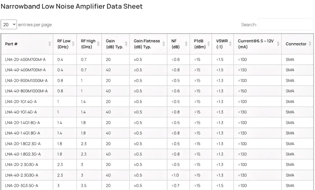 | LNA-20-1G1.4G-A | 1 | 1.4 | 20 | ±0.5 | <0.5 | >15 | <1.3 | <100 | SMA |