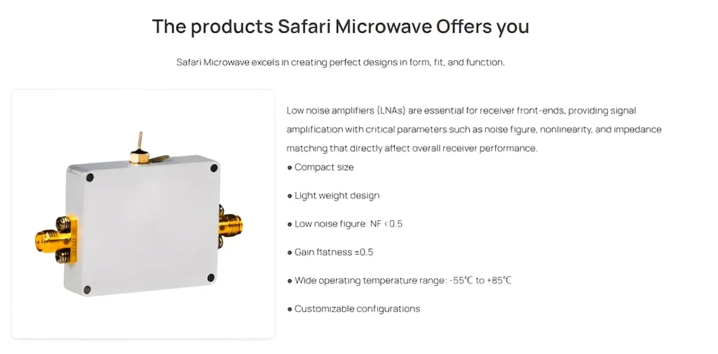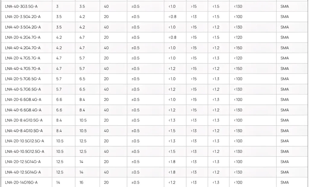 | LNA-40-4.2G4.7G-A | 4.2 | 4.7 | 40 | ±0.5 | <1.0 | >15 | <1.2 | <150 | SMA |