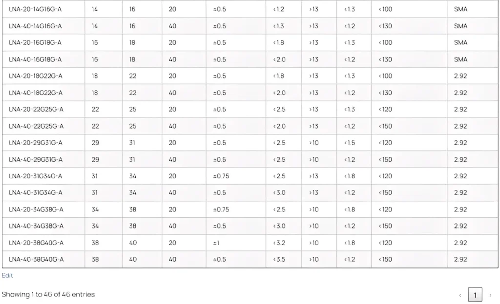 | LNA-40-18G22G-A | 18 | 22 | 40 | ±0.5 | <2.0 | >13 | <1.2 | <130 | 2.92 |
