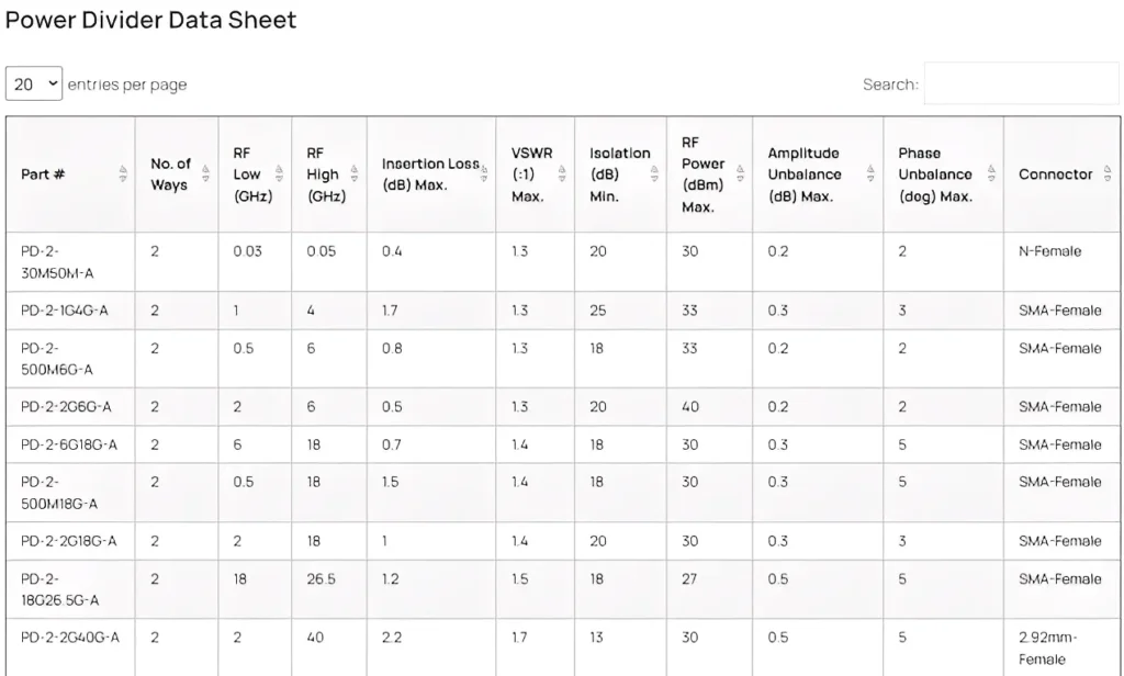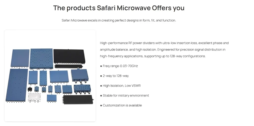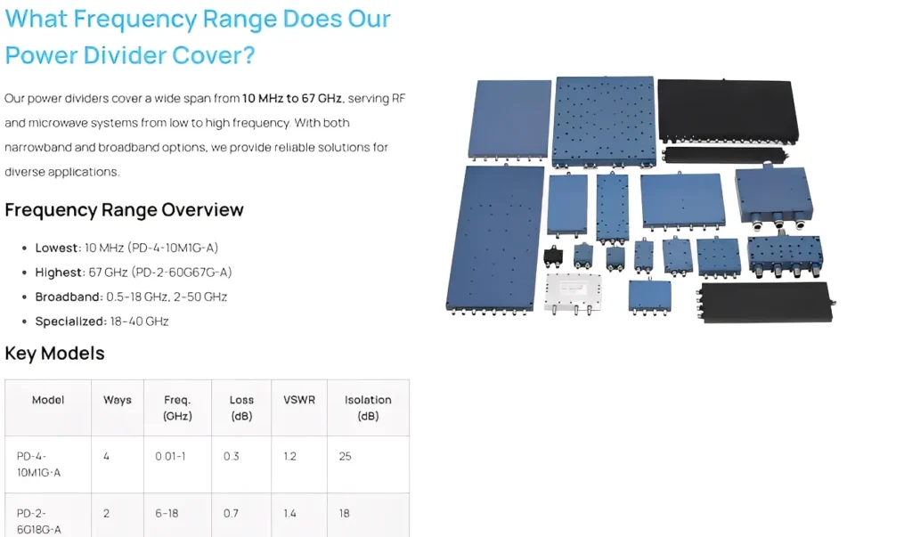 High-performance RF power dividers with ultra-low insertion loss, excellent phase and amplitude balance, and high isolation. Engineered for precision signal distribution in high-frequency applications, supporting up to 128-way configurations.