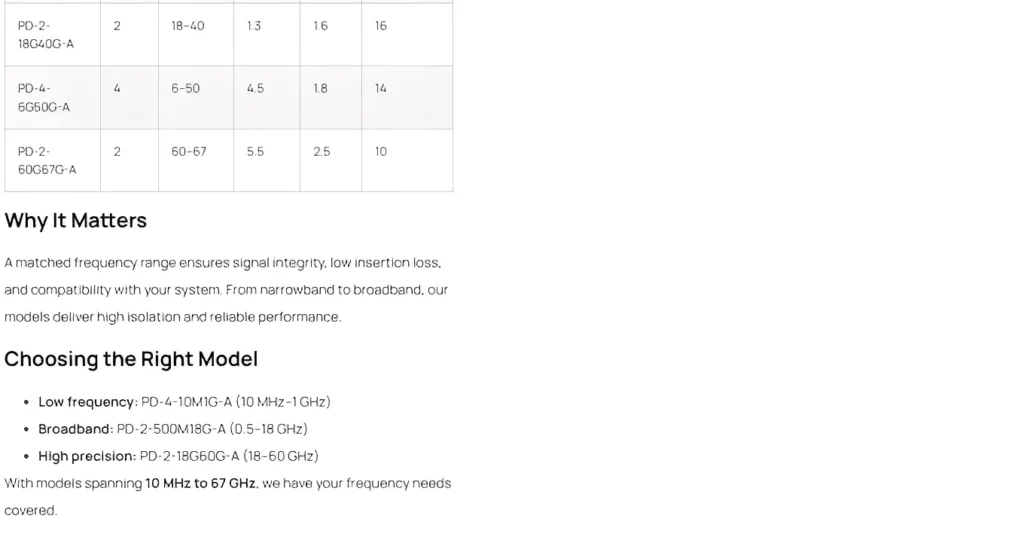 A matched frequency range ensures signal integrity, low insertion loss, and compatibility with your system. From narrowband to broadband, our models deliver high isolation and reliable performance.
