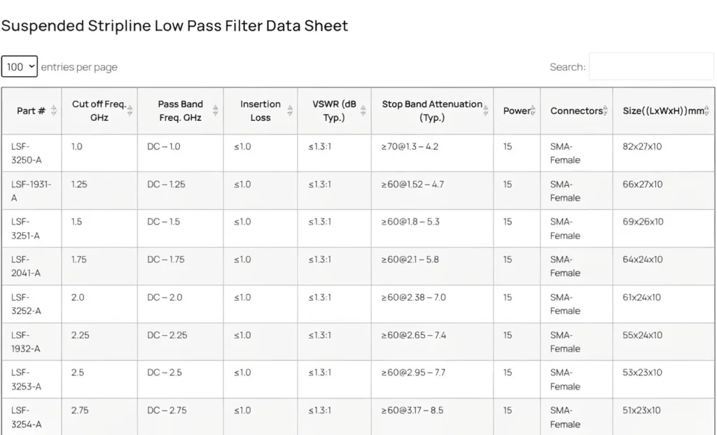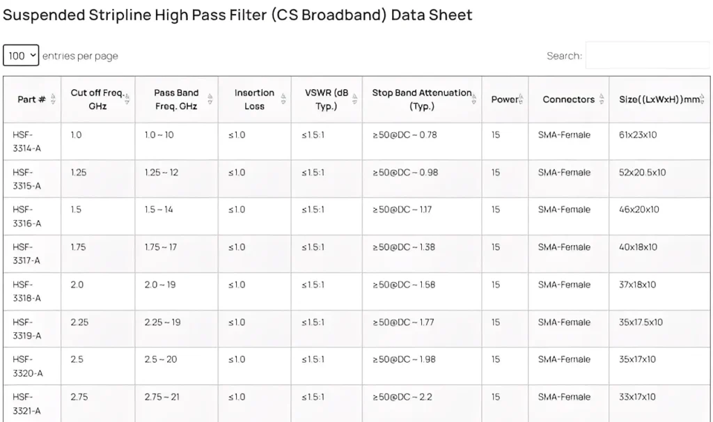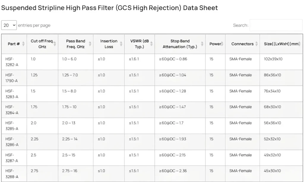 Part #Cut off Freq. GHzPass Band Freq. GHzInsertion LossVSWR (dB Typ.)Stop Band Attenuation (Typ.)PowerConnectorsSize((LxWxH))mm