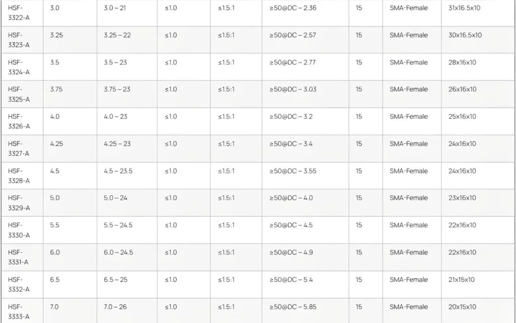 HSF-3325-A3.753.75~23≤1.0≤1.5:1≥50@DC~3.0315SMA-Female26x16x10