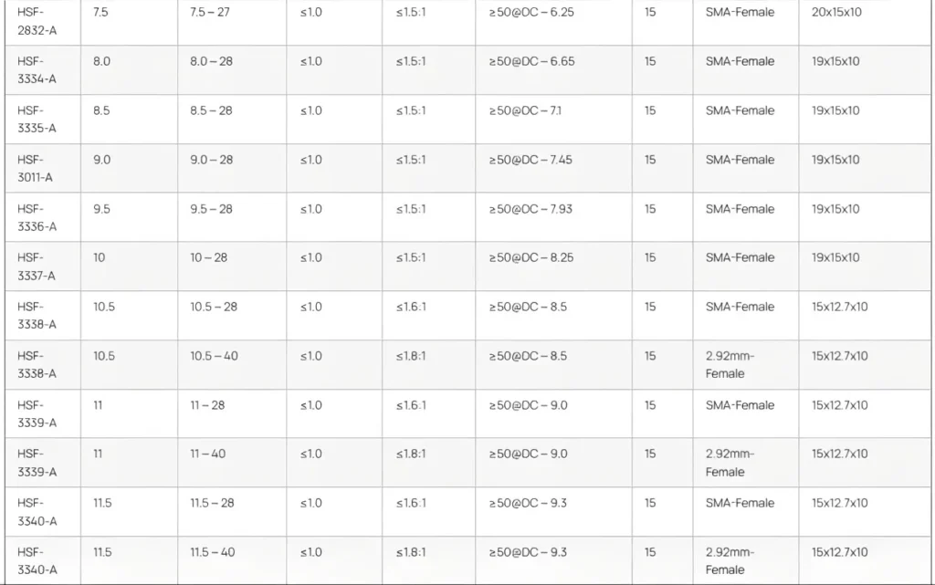 HSF-3334-A8.08.0~28≤1.0≤1.5:1≥50@DC~6.6515SMA-Female19x15x10