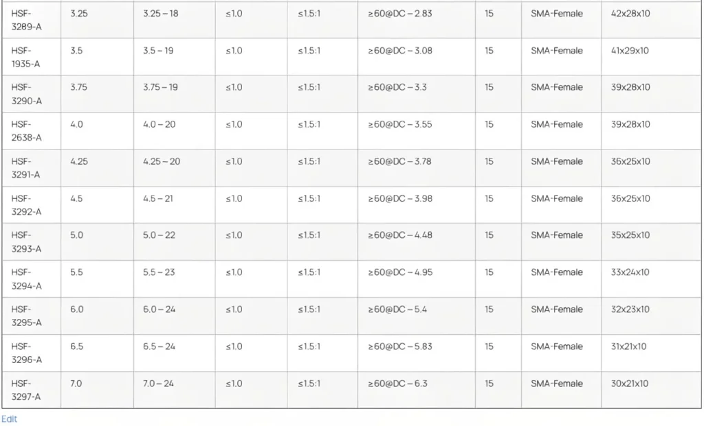 HSF-1935-A3.53.5~19≤1.0≤1.5:1≥60@DC~3.0815SMA-Female41x29x10