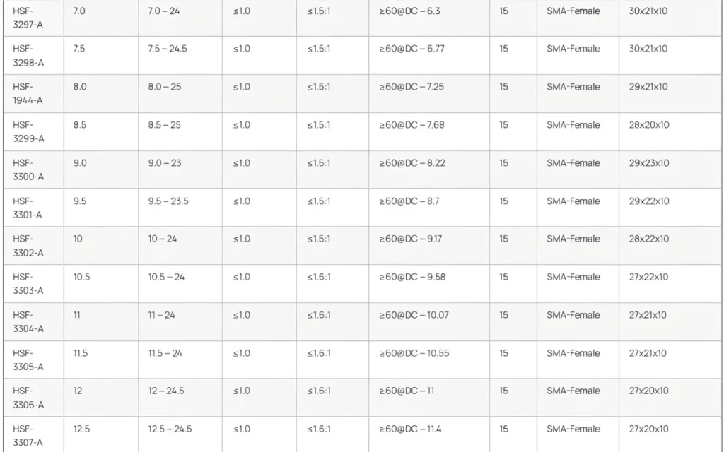 HSF-3297-A7.07.0~24≤1.0≤1.5:1≥60@DC~6.315SMA-Female30x21x10