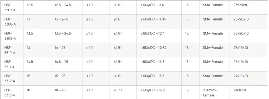 HSF-3307-A12.512.5~24.5≤1.0≤1.6:1≥60@DC~11.415SMA-Female27x20x10