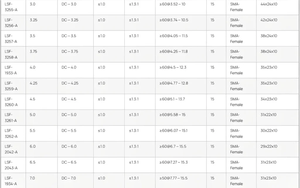 LSF-3262-A5.5DC~5.5≤1.0≤1.3:1≥60@6.07~15.115SMA-Female30x22x10