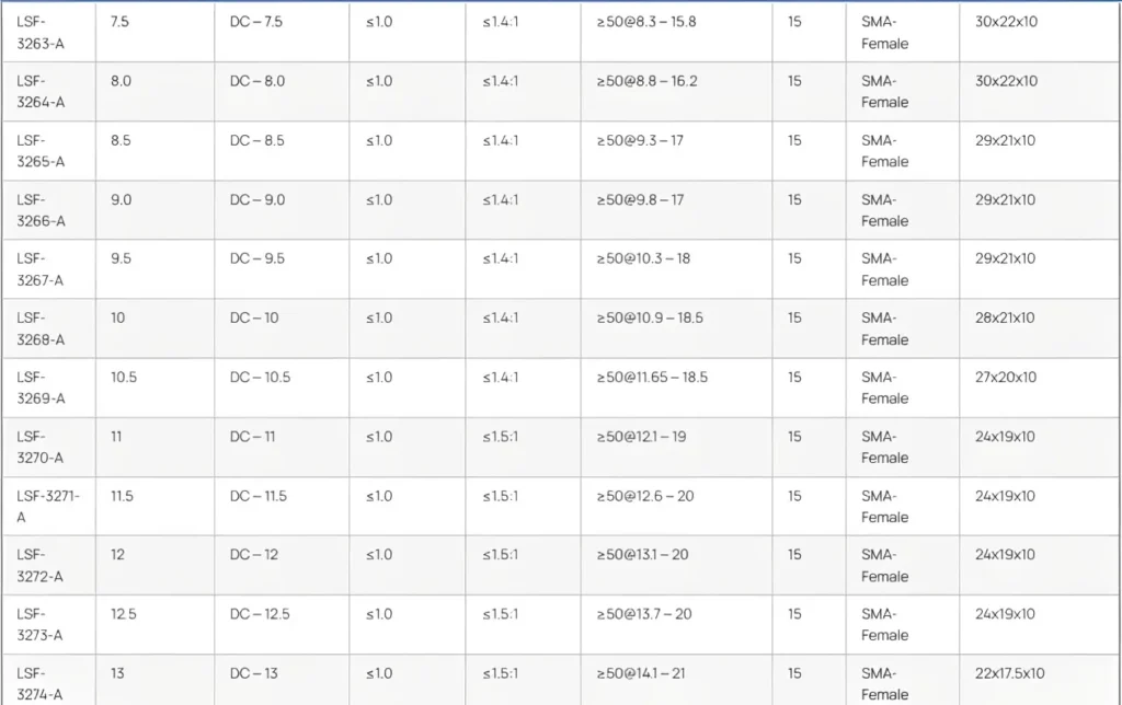 LSF-3274-A13DC~13≤1.0≤1.5:1≥50@14.1~2115SMA-Female22x17.5x10