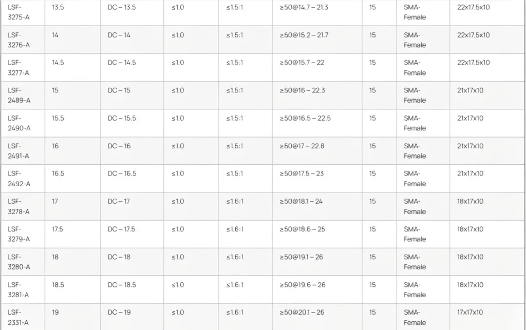 LSF-3281-A18.5DC~18.5≤1.0≤1.6:1≥50@19.6~2615SMA-Female18x17x10